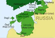 Local nobles turned to Charles for protection in 1600 when the conflict spread to Livonia, where Sigismund had tried to incorporate Swedish Estonia into the Duchy of Livonia.[103] Charles then expelled the Polish forces from Estonia[103] and invaded the Livonian duchy, starting a series of Polish–Swedish wars.[104] At the same time, Russia was embroiled in civil war over the vacant Russian throne ("Time of Troubles") when none of the many claimants had prevailed. This conflict became intertwined with the Livonian campaigns when Swedish and Polish–Lithuanian forces intervened on opposite sides, the latter starting the Polish–Muscovite War.[104] Charles IX's forces were expelled from Livonia[105] after major setbacks at the battles of Kokenhausen(1601) and Kircholm (1605).[106][105] During the later Ingrian War, Charles' successor Gustavus Adolphus retook Ingria and Kexholm which were formally ceded to Sweden under the 1617 Treaty of Stolbovo[105] along with the bulk of the Duchy of Livonia. In 1617, when Sweden had recovered from the Kalmar War with Denmark, several Livonian towns were captured, but only Pernau (Pärnu) remained under Swedish control after a Polish–Lithuanian counter-offensive.[107] A second campaign then started with the capture of Riga in 1621 and expelled Polish–Lithuanian forces from most of Livonia, where the dominion of Swedish Livonia was created.[103] Swedish forces then advanced through Royal Prussia and Poland–Lithuania accepted Swedish gains in Livonia in the 1629 Treaty of Altmark.[108]