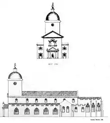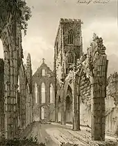 Thirty years after the cathedral roof collapsed, the chapter asked an architect, John Wood, the Elder, to prepare estimates and plans to restore the cathedral.[45] In 1734 work began on a new cathedral, designed by Wood.[46] Wood produced an Italian temple[47] style edifice, working only on the eastern portion of the building, while leaving the remaining western half in ruins.[45] What Wood was trying to build at Llandaff was not Italian, but a recreation of Solomon's Temple.[48] Another sixteen years passed before the chapter solicited funds to repair the western half of the building.[49][lower-alpha 13] Wood's plans were to replace the western entrance of the cathedral with a tower and rustic porch.[50] No changes were made to the western entrance until Wyatt and Prichard began their work in 1841, when the damage to the western portion of the structure was repaired and all traces of the Italian temple work by Wood had been removed from the cathedral.[51][52][lower-alpha 14]