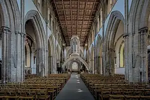 The original pre-Norman church was recorded in the 12th-century Book of Llandaff to have been no more than 28 feet (8.5 m) long, 15 feet (4.6 m) wide and 20 feet (6.1 m) high. It contained low, narrow aisles with an apsidal porticus measuring 12 feet (3.7 m) long.[92] Construction began of a grander building under the orders of the second Norman bishop of Llandaff, Urban, in the 1120s, to administer power over the newly formed diocese. It doesn't appear to have lasted long as an extensive construction was ordered between 1193 and 1218 during the episcopate of Henry of Abergavenny. The western parts replaced those that Urban had built, and the nave and front of this side remain today. The fine craftsmanship and subtlety of the architecture show a clear similarity to those of Glastonbury Abbey and Wells Cathedral, so it is probable that several of the leading craftsman of Somerset were hired for the building.[92]