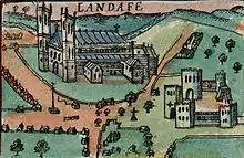 The Normans occupied Glamorgan early in the Norman conquest, appointing Urban their first bishop in 1107.[10][lower-alpha 2] He began construction of the cathedral in 1120[12] and had the remains of Saint Dyfrig transferred from Bardsey.[13][lower-alpha 3] After the death of Urban, it is believed the work was completed some time in the last years of Bishop Nicholas ap Gwrgant, who died in 1183.[15] The cathedral was dedicated to Saints Peter and Paul, Dubricius, Teilo and Oudoceus.[16]