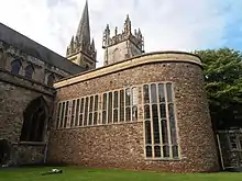 The south side of the nave is characterized by eight bays with stepped buttresses between them, with aisle windows featuring reticulated heads.[86] At the side of the south aisle of the sanctuary is Chapter House, a small, two-story square building. It dates to the mid 13th century[96] and is made from Chipping Camden and Bath limestone, with some local red sandstone from Radyr.[86] The octagonal roof was the brainchild of Prichard, though it was lowered in pitch by Pace and later worked on by Donald Buttress. The buttresses of the building are made from ashlar. The seven stained-glass roundels are of 16th-century Flemish origin. In the interior is a pulpit featuring Moses.[96] Also of note is the St David's Chapel, added by George Pace in 1953–1956, which is accessed through the Norman north door of the cathedral.[86]