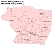 For elections to the Greater London Council, the borough formed the Enfield electoral division, electing three members. In 1973 it was divided into the single-member Edmonton, Enfield North and Southgate electoral divisions.[13] The Greater London Council was abolished in 1986.
