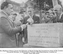 - "Laying of foundation stone of London Nizamia Mosque, June 1937". wokingmuslim.org. Archived from the original on 2 September 2011. Retrieved 21 July 2011.