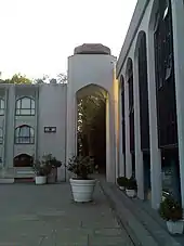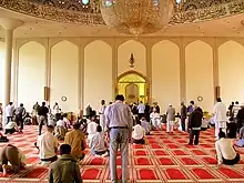 It was designed by Sir Frederick Gibberd, completed in 1977,[2] and has a prominent golden dome.[3] The main hall can accommodate over 5,000 male worshippers,[4] with women praying on a balcony overlooking the hall. The mosque holds a chandelier and a vast carpet, with very little furniture.
