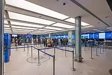 With space limited in the London Docklands area, and comparatively low passenger volumes, London City Airport is small compared with several other airports serving London, such as Heathrow, Gatwick, Stansted, Southend and Luton. The airport has a single, two-storey passenger terminal building with 18 gates, all hardstands. The ground floor contains the check-in desks and some service facilities as well as a staircase leading to the security control on the upper level, after which the airside waiting area and several more shops can be found.[47] The waiting area is connected to piers on both sides where corridors on the upper floor lead to the departure gates on the ground level. As the airport has no jet bridges, walk-boarding is used on all stands.