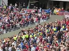 The black-and-white seating design from the Olympics was replaced with a white, blue and claret design. The new design includes West Ham's name on the East Kop Stand and symbolic crossed hammers on all lower-tier stands, and the retention of the 2012 shard design on the upper tier, albeit in new colouring to match the stadium's anchor tenant.[63] Work continued through 2016 to transform the stadium into a home for West Ham, with the club's colours and giant model West Ham shirts added to the stadium concourse.[64] A West Ham store and coffee shop was opened on 23 June.[65] In February 2019, it was announced that the East Stand would be renamed in honour of Billy Bonds.[66] In an attempt to make the London Stadium more like their home ground, in April 2019 a £250,000 claret-coloured pitch surround was announced and installed.[67] In February 2020, West Ham announced planned alterations to the stadium introducing two new lower-tier stands moving supporters closer to the pitch, many by more than four metres (13 feet).[68] In March 2020, West Ham opened a sensory room in the stadium for fans.[69] On 6 April 2022, West Ham announced that the capacity for football matches will be bumped from 60,000 to 62,500 and the lower tier of the west stand is to be reconfigured to make the stadium more football-oriented.[70]