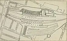 For each extension, the long-term plan was that the expansion was "temporary" until the line was extended past Waterloo, and therefore these additions were simply added alongside and around the existing structure rather than as part of an overall architectural plan. This resulted in the station becoming increasingly ramshackle. The platform numbering had grown in an ad hoc manner, resulting in the confusing situation of No. 1 being in the middle of the station complex, where it had been since 1848.[18] The original station became known as the "Central Station" as other platforms were added. The new platform sets were known by nicknames – the two platforms added for suburban services in 1878 were the "Cyprus Station", and the six built in 1885 for use by trains on the Windsor line became the "Khartoum".[19] Each of these stations-within-a-station had its own booking office, taxi stand and public entrances from the street, as well as often poorly marked and confusing access to the rest of the station.[18]