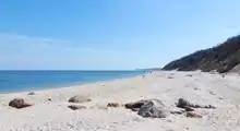 The land to the south of this moraine to the South Shore is the outwash plain of the last glacier. One part of the outwash plain was known as the Hempstead Plains, and this land contained one of the few natural prairies to exist east of the Appalachian Mountains.[56] The glaciers melted and receded to the north, resulting in the difference between the topography of the North Shore beaches and the South Shore beaches. The North Shore beaches are rocky from the remaining glacial debris, while the South Shore's are crisp, clear, outwash sand. Jayne's Hill, at 401 feet (122 m), within Suffolk County near its border with Nassau County, is the highest hill along either moraine; another well-known summit is Bald Hill in Brookhaven Town, not far from its geographical center at Middle Island. The glaciers also formed Lake Ronkonkoma in Suffolk County and Lake Success in Nassau County, each a deep kettle lake.
