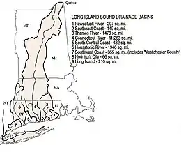 The whole watershed population is about 8.93 million as of the 2010 Census.[3] Due to extent of the Connecticut River, many riverside cities and towns are included in the Long Island Sound watershed. The largest towns and cities from south to north, west to east are:[4]