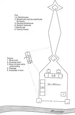 After the early explorations, the U.S. government sought to establish control of the region, since trade along the Mississippi and Missouri rivers was still dominated by British and French traders from Canada and allied Indians, especially the Sauk and Fox. The U.S. adapted the former Spanish facility at Fort Bellefontaine as a fur trading post near St. Louis in 1804 for business with the Sauk and Fox.[67] In 1808 two military forts with trading factories were built, Fort Osage along the Missouri River in western present-day Missouri and Fort Madison along the Upper Mississippi River in eastern present-day Iowa.[68] With tensions increasing with Great Britain, in 1809 Fort Bellefontaine was converted to a U.S. military fort and was used for that purpose until 1826.[69]