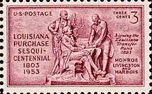 The Louisiana Purchase (French: Vente de la Louisiane, lit. 'Sale of Louisiana') was the acquisition of the territory of Louisiana by the United States from the French First Republic in 1803. This consisted of most of the land in the Mississippi River's drainage basin west of the river.[1] In return for fifteen million dollars, or approximately eighteen dollars per square mile, the United States nominally acquired a total of 828,000 sq mi (2,140,000 km2; 530,000,000 acres) in Middle America. However, France only controlled a small fraction of this area, most of which was inhabited by Native Americans; effectively, for the majority of the area, the United States bought the preemptive right to obtain Indian lands by treaty or by conquest, to the exclusion of other colonial powers.[2][3]