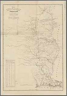The U.S. claimed that Louisiana included the entire western portion of the Mississippi River drainage basin to the crest of the Rocky Mountains and land extending to the Rio Grande and West Florida.[56] Spain insisted that Louisiana comprised no more than the western bank of the Mississippi River and the cities of New Orleans and St. Louis.[57] The dispute was ultimately resolved by the Adams–Onís Treaty of 1819, with the United States gaining most of what it had claimed in the west.