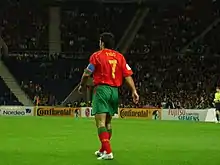 Figo captained the squad during the 2006 World Cup, leading the team to the semi-finals. With three wins, Portugal finished top of their group and qualified for the knock-out rounds with Mexico. They advanced past the Netherlands in the last 16, and defeated England on penalties in the quarter-final. Figo did not take part in the shootout, having been substituted for Hélder Postiga.[32] In the semi-final, Portugal was beaten by France courtesy of a penalty from his former club-mate and French captain Zinedine Zidane. This was Portugal's best finish in 40 years. The third-place playoff caused some controversy as Figo did not start; Pauleta captained the team in his place. However, Portugal fell behind 2–0 to hosts Germany and Figo replaced Pauleta in the 77th minute, who handed him back the captain's armband to cheers from both Portuguese and German fans. Although Germany scored another goal shortly after Figo's entrance, he ended his final cap for his country on a high note by setting up Nuno Gomes to head in an 88th-minute consolation goal,[33] thus passing his number 7 jersey down to his successor, Cristiano Ronaldo.