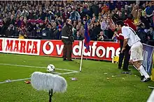 When Figo returned to Barcelona for the first time in a Real Madrid shirt on 21 October 2000, the noise at Camp Nou was deafening.[17] There were banners hung around the stadium with words like "Traitor", "Judas", "Scum", and "Mercenary".[17] Figo was mercilessly taunted throughout, and when he came out of the tunnel and ran onto the field the jeers of almost 98,000 Barcelona fans escalated, with a visibly shocked Figo putting his fingers to his ears.[15][17] When El Clásico started, each time Figo got the ball the noise rose with insults and missiles flying such as oranges, bottles, cigarette lighters and mobile phones.[17] The regular corner taker for Madrid, Figo did not take any corners at the Camp Nou to avoid being in close proximity to the fans.[17] Barcelona were victorious, winning 2–0, and Real Madrid President Florentino Pérez stated after the match, "The atmosphere got to us all."[17] Madrid defender Iván Campo commented,