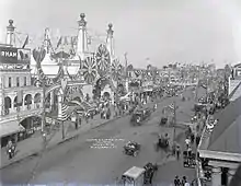 The arched entrance on Surf Avenue was described in The Street Railway magazine as "covering half of an entire city block",[228][229] with four monolithic figures, one at each of its corners.[30][31][229] The entrance gate contained five ticket kiosks, shaped like Roman chariots and staffed by "young women dressed in evening attire and Merry Widow straw hats emblazoned with red feathers".[230] A large avenue called the Court of Honor extended straight from the entrance and was surrounded by 53 buildings.[230] There was a replica of Venice to the right of the court,[31][228] which included a miniature Grand Canal with gondoliers, as well as a model of the Piazza San Marco.[230] To the left of the Court of Honor were three large buildings, which featured the Trip to the Moon, War of Worlds, and 20,000 Leagues Under the Sea attractions.[30][231] Other attractions, which housed various shows, the Grand Casino, and the Old Mill and Helter Skelter attractions, were placed alongside the Court of Honor.[38]