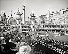 Luna Park was an amusement park in Coney Island, Brooklyn, New York City. The park was located on a site bounded by Surf Avenue to the south, West 8th Street to the east, Neptune Avenue to the north, and West 12th Street to the west. Luna Park opened in 1903 and operated until 1944. It was located partly on the grounds of the small park it replaced, Sea Lion Park, which operated between 1895 and 1902. It was the second of the three original, very large, iconic parks built on Coney Island; the others were Steeplechase Park (1897, by George C. Tilyou) and Dreamland (1904, by William H. Reynolds).[1] At Coney Island's peak in the middle of the 20th century's first decade, the three amusement parks competed with each other and with many independent amusements.