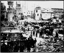 A fire on August 13, 1944, destroyed much of Luna Park, causing $800,000 in damage.[167][168] Among the attractions destroyed in the fire were the Dragon's Gorge, the Mile Skyway roller coaster, the Coca-Cola tower, and various games and flat rides.[169][170] The western half of the park was destroyed, but the main entrance, administration building, swimming pool, and other rides near the park's entrance were not seriously damaged.[170] The undamaged part of Luna Park reopened on August 18[171] and continued to operate until September 15, 1944.[172] Before the fire, the park's business had suffered due to declining patronage and a lack of new attractions.[173] The few rides that survived the fire also operated during the 1945 season,[174] but the interior of the park remained closed.[175] During that season, Prudence Bonds leased the rides along Surf Avenue to Abe Siskin, Phil Pates, and Chick Guelfi,[176][177] who renovated the Ole Opry House attraction into a music hall called Little Old New York.[178]