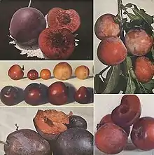 He named Stark Bro's Nurseries & Orchards Co. to carry on the work. Considerable argument has been spent upon whether the plants were technically willed to Stark Bro's; they were not. He left everything to Elizabeth: money, personal property, real estate, dozens of municipal utility bonds — and the plants and precious seeds.[8] Elizabeth had first approached both Stanford and Berkeley to have either or both universities take over the experimental farm, but sold to Stark when those proffers didn't materialize. Mrs. Burbank entered into an agreement with Stark Bro's on August 23, 1927, to take the material they wanted from Burbank's properties. The contract included ownership of the business name and all of the customer information. A September 6, 1927, contract provided exclusive rights to sell uncompleted experiments with fruits at Sebastopol (except the Royal and Paradox) for 10 years. Stark Bro's had right of renewal. Tax receipts indicate payments of $27,000 to Mrs. Burbank.[8] Exciting new kinds of fruits and flowers Burbank had developed (but never marketed) included 120 types of plums, 18 peaches, 28 apples, 500 hybrid roses, 30 cherries, 34 pears, 52 gladioli and many more. Stark Bro's subsequently introduced many of these varieties of their catalog.[8]