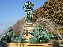 The bronze fountain represents the work of four sculptors: Louis Vuillemot carved the garlands and festoons around the pedestal, Pierre Legrain carved the armillary with interior globe and zodiac band; the animalier Emmanuel Fremiet designed the eight horses, marine turtles and spouting fish. Most importantly Jean-Baptiste Carpeaux sculpted the four nude women supporting the globe, representing the Four Continents of classical iconography.