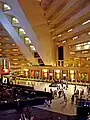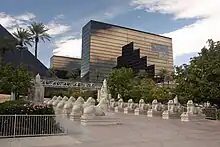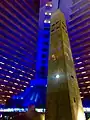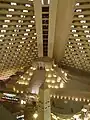 The hotel includes 4,407 rooms.[49] It originally opened with 2,526 rooms, all of them located in the pyramid.[50] The rooms line the pyramid's interior walls, and walkways outside the rooms overlook the atrium.[51] The interior of the pyramid uses inclined elevators, traveling at a 39-degree angle, to bring guests to their rooms.[11][7] The structure features eight elevators, with two at each corner of the pyramid.[6] The two additional hotel towers added in 1996 are located just north of the pyramid.[21][23] The ziggurat-shaped towers,[23] designed by Klai Juba Architects,[52] are 22 stories and added nearly 2,000 additional rooms.[21][23] The exterior of the hotel structures, including the pyramid, is made up of black glass panels.[48]
