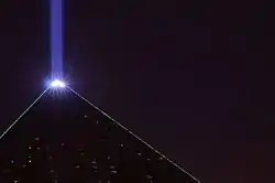 The tip of the pyramid is three stories,[47] and features a beam of light known as the Luxor Sky Beam.[56][57] It is the most powerful man-made light in the world,[58] using curved mirrors to collect the light from 39 xenon lamps and focus them into one intense, narrow beam.[59][60] G-Force International Entertainment Corporation was hired to design, build and install the lighting system.[61] Each lamp is 7,000 watts and cost approximately $1,200 as of 2001; at full power, the system cost $51 an hour to operate, with $20 of that going toward electricity.[62]