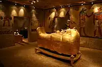 King Tut's Tomb and Museum opened at the Luxor in December 1993.[85][86] It consisted of four rooms dedicated to Egyptian history, featuring replicas of various ancient items;[85][87] these were created for the museum by artists near Cairo, and Egyptologist Zahi Hawass gave his approval of the items before they were put on display.[88] The museum's centerpiece was a replica of King Tutankhamen's tomb, as found in the Valley of the Kings. The replica cost approximately $360,000.[17][85][87]