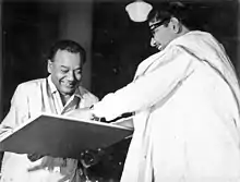 At the age of fifteen, Karunanidhi started his own magazine Maanavanesan (transl. friends of students). He along with his friends would make fifty copies of the magazine and circulate it and also sometimes mailed them to the leaders of Self-respect movement.[36] A political activist after reading his magazine asked him to lead the forum for peace, liberty equality and justice, he accepted and became its elected secretary. Later, he dissolved the forum after there was a blatant attempt to convert the forum into as a front of the Congress party. He refunded the subscription money many refused to take the refund.[37] Using the rest of ₹75, he started the Tamil Nadu Tamil students association in 1941.[38] In 1942, the association held an annual function attended by Bharathidasan K.A Anbazhagan and K. A. Mathiazhagan and student leaders from Annamalai university. He couldn't afford to pay for the invitees' and guest speakers' travels and expenditures, so he was forced to steal a gold necklace that his mother had made for him but which he rarely wore, pawned it for ₹50, and paid his invitees.[38]