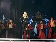 The tour portrayed controversial subjects such as violence, firearms, human rights, nudity, and politics. During one sequence the face of French far right politician Marine Le Pen appeared on the screen with a swastika on her forehead.[94][95][96] Other segments showed the singer attacking dancers with fake guns, blood spattering on the backdrop screens, mooning, and briefly exposing her breasts to the audience.[97][98][99][100] Despite the controversies, the MDNA Tour received positive reviews and became the highest-grossing tour of 2012 and was at that time the tenth highest-grossing tour of all time, grossing $305.1 million in ticket sales from 88 sold-out shows, watched by an audience of 2.21 million.[101][102] The Miami shows on November 19–20, 2012 were recorded and released as a live album.[103]