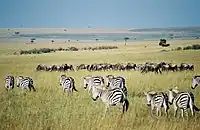 Blue wildebeest, topi, plains zebra and Thomson's gazelle migrate into and occupy the Mara reserve, from the Serengeti plains to the south and Loita Plains in the pastoral ranches to the north-east, from July to October or later. Herds of all three species are also resident in the reserve.