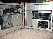 The case could be opened by operating a single lever on the back, which unlocked one of the two sides of the machine, as well as the drive bays. All of the expansion slots for memory, PCIe cards and drives could be accessed with the side panel removed and no tools were required for installation.[22] The Mac Pro's Xeon processors generated much less heat than the previous 2-core G5s, so the size of the internal cooling devices were reduced significantly.