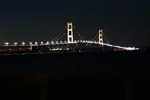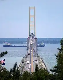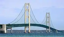 The Mackinac Bridge (/ˈmækənɔː/ MAK-ə-naw; also referred to as the Mighty Mac or Big Mac)[4] is a suspension bridge that connects the Upper and Lower peninsulas of the U.S. state of Michigan. It spans the Straits of Mackinac, a body of water connecting Lake Michigan and Lake Huron, two of the Great Lakes. Opened in 1957, the 26,372-foot-long (4.995 mi; 8.038 km)[1] bridge is the world's 27th-longest main span and is the longest suspension bridge between anchorages in the Western Hemisphere.[5] The Mackinac Bridge is part of Interstate 75 (I-75) and the Lake Michigan and Huron components of the Great Lakes Circle Tour across the straits; it is also a segment of the U.S. North Country National Scenic Trail. The bridge connects the city of St. Ignace to the north with the village of Mackinaw City to the south.