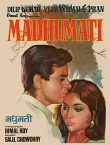 Madhumati is a 1958 Indian Hindi-language paranormal romance film directed and produced by Bimal Roy, and written by Ritwik Ghatak and Rajinder Singh Bedi. The film stars Vyjayanthimala and Dilip Kumar in lead roles, with Pran and Johnny Walker in supporting roles. The plot focuses on Anand, a modern man who falls in love with a tribal woman named Madhumati. But they face challenges in their relationship finally leading to a paranormal consequence. It was ranked 11th in the Outlook Magazine's 25 leading Indian directors' poll for selecting Bollywood's greatest films in 2003.[2]