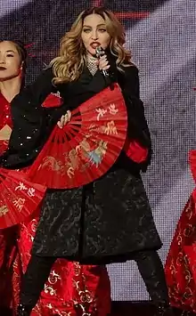![]() Madonna performing "Bitch I'm Madonna" at the Rebel Heart Tour (2015–2016). The song's music video became her first clip to cross 100 million views on platform Vevo.[1] | |