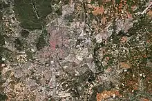 The intense demographic growth experienced by the city via mass immigration from the rural areas of the country led to the construction of plenty of housing in the peripheral areas of the city to absorb the new population (reinforcing the processes of social polarization of the city),[78] initially comprising substandard housing (with as many as 50,000 shacks scattered around the city by 1956).[79] A transitional planning intended to temporarily replace the shanty towns were the poblados de absorción, introduced since the mid-1950s in locations such as Canillas, San Fermín, Caño Roto, Villaverde, Pan Bendito, Zofío and Fuencarral, aiming to work as a sort of "high-end" shacks (with the destinataries participating in the construction of their own housing) but under the aegis of a wider coordinated urban planning.[80]