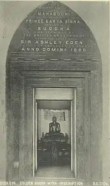 During the 13th century and again the 19th century, Burmese rulers undertook restoration of the temple complex and surrounding wall.[30] In the 1880s, the then-British colonial government of India began to restore Mahabodhi Temple under the direction of Sir Alexander Cunningham and Joseph David Beglar. In 1884, a large Buddha image of the Pāla period, likely removed at an earlier stage to the Mahant's residence from the temple sanctum, was reinstated.[31] The plith of the image was reconstructed at the time and parts of the dedicatory inscription inserted in their current position.[32] The inscription records the rededication of the image by Pīṭhīpati Jayasena in the 13th century. In 1886, Sir Edwin Arnold visited the site and under guidance from Ven. Weligama Sri Sumangala published several articles drawing the attention of the Buddhists to the deplorable conditions of Buddhagaya.[33][34] The sculpture has since been repaired, painted and gilded and is under active worship in the sanctum.