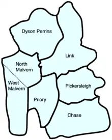 Residents of Malvern Town in the six Malvern Town Council electoral wards are represented by 15 elected members.[68] The council is supported by a team of senior executives that includes a Town Clerk, a Deputy Town Clerk, a PA to the Town Clerk and chairman, an Operations and Events Officer, a Finance Officer, two Operations Managers, an Operations Supervisor, and eight Grounds Maintenance Operatives.[12] The wards are based on the distribution of the population and generally ignore the names of the neighbourhoods and suburbs they contain, and use loaned names: