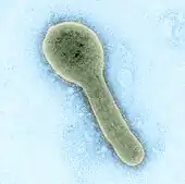 Like all filoviruses, marburgvirions are filamentous particles that may appear in the shape of a shepherd's crook or in the shape of a "U" or a "6", and they may be coiled, toroid, or branched.[18] Marburgvirions are generally 80 nm in width, but vary somewhat in length. In general, the median particle length of marburgviruses ranges from 795 to 828 nm (in contrast to ebolavirions, whose median particle length was measured to be 974–1,086 nm), but particles as long as 14,000 nm have been detected in tissue culture.[19]