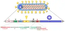 Marburgvirions consist of seven structural proteins. At the center is the helical ribonucleocapsid, which consists of the genomic RNA wrapped around a polymer of nucleoproteins (NP). Associated with the ribonucleoprotein is the RNA-dependent RNA polymerase (L) with the polymerase cofactor (VP35) and a transcription activator (VP30). The ribonucleoprotein is embedded in a matrix, formed by the major (VP40) and minor (VP24) matrix proteins. These particles are surrounded by a lipid membrane derived from the host cell membrane. The membrane anchors a glycoprotein (GP1,2) that projects 7 to 10 nm spikes away from its surface. While nearly identical to ebolavirions in structure, marburgvirions are antigenically distinct.[20]