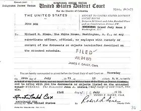 Marbury also established that the power of judicial review covers actions by the executive branch—the President and his cabinet members. However, American courts' power of judicial review over executive branch actions only extends to matters in which the executive has a legal duty to act or refrain from acting, and does not extend to matters that are entirely within the President's discretion, such as whether to veto a bill or whom to appoint to an office. This power has been the basis of later important Supreme Court decisions. In its 1974 decision United States v. Nixon, for example, the Supreme Court held that President Richard Nixon had to comply with a subpoena to provide tapes of his conversations for use in a criminal trial related to the Watergate scandal, which ultimately led to Nixon's resignation.[63][64]
