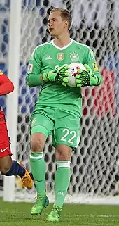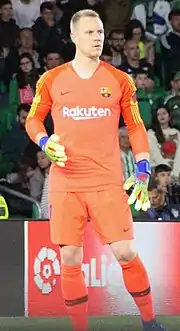 Marc-André ter Stegen (German pronunciation: [ˌmaʁk ʔanˈdʁeː teːɐ̯ ˈsteːɡn̩, - ʔãˈdʁeː -] ⓘ;[4] born 30 April 1992), is a German professional footballer who plays as a goalkeeper for La Liga club Barcelona and the Germany national team.[5][6][7] Regarded as a highly promising player in his youth,[8] he has since established himself as one of the best goalkeepers in world football.[9][10][11][12][13] Known for his reflexes, passing, and ball-playing ability,[14] he has been often nicknamed as the Berlin Wall because of his reflexes and ball control abilities as a goalkeeper.[15]