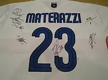 Materazzi made his debut for the Italy national team on 25 April 2001, in a 1–0 friendly match victory against South Africa.[80] He made two appearances in the qualifying campaign against Georgia and Hungary. In the final tournament of the 2002 FIFA World Cup, Materazzi was used as a reserve player to back up Alessandro Nesta and Fabio Cannavaro. He made only one appearance by coming on as a substitute for Nesta in the 2–1 loss to Croatia in the group stage but soon in the 90th minute Materazzi played a floating ball over the top from just over half way to Inzaghi but everyone missed the ball and it rolled in the back of the net but the goal was disallowed after referee Graham Poll claimed that Inzaghi had grabbed an opponent's shirt.[81] Materazzi was later criticised for his defending on both of Croatia's goals during the match.[82][83]