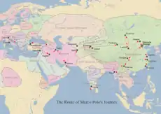 Born in Venice, Marco learned the mercantile trade from his father and his uncle, Niccolò and Maffeo, who travelled through Asia and met Kublai Khan. In 1269, they returned to Venice to meet Marco for the first time. The three of them embarked on an epic journey to Asia, exploring many places along the Silk Road until they reached Cathay (China). They were received by the royal court of Kublai Khan, who was impressed by Marco's intelligence and humility. Marco was appointed to serve as Khan's foreign emissary, and he was sent on many diplomatic missions throughout the empire and Southeast Asia, such as in present-day Burma, India, Indonesia, Sri Lanka and Vietnam.[5][6] As part of this appointment, Marco also travelled extensively inside China, living in the emperor's lands for 17 years and seeing many things that had previously been unknown to Europeans.[7] Around 1291, the Polos also offered to accompany the Mongol princess Kököchin to Persia; they arrived around 1293. After leaving the princess, they travelled overland to Constantinople and then to Venice, returning home after 24 years.[7] At this time, Venice was at war with Genoa; Marco was captured and imprisoned by the Genoans after joining the war effort and dictated his stories to Rustichello da Pisa, a cellmate. He was released in 1299, became a wealthy merchant, married, and had three children. He died in 1324 and was buried in the church of San Lorenzo in Venice.