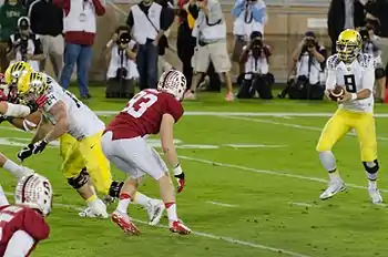 Mariota suffered a partial tear of the MCL against UCLA on October 26 but continued to play the remainder of the season.[30] After Oregon's 8–0 start, Mariota was featured on the national cover of the November 4, 2013, issue of Sports Illustrated[31] as the favorite to win the Heisman Trophy before the No. 2 ranked Ducks fell to No. 6 Stanford on November 7.[32] Despite Oregon's 11–2 season record and top-ten ranking, Mariota's sophomore season was considered a letdown after the Ducks failed to reach a BCS bowl berth for the first time since the 2008 season.[33][34]