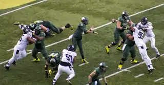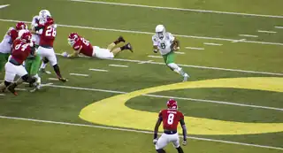 Starting in all 13 games, Mariota threw for 2,677 yards on 230-of-336 passing attempts (68.5%), including 32 touchdowns against only six interceptions. He also rushed the ball 106 times for 752 yards (7.1 yards per carry) and five touchdowns.[24] His athletic versatility was exhibited against Arizona State,[25] when he caught a touchdown pass, threw a touchdown pass, and then ran for an 86-yard touchdown, achieving all three scores with 12 minutes still left in first half.[26]