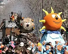 The three-day Carnival of Binche, near Mons, is one of the best known in Belgium. It takes place around Shrove Tuesday (or Mardi Gras) just before Lent. Performers known as Gilles wear elaborate costumes in the national colours of red, black and yellow. During the parade, they throw oranges at the crowd.[8] In 2003, it was recognized by UNESCO as one of the Masterpieces of the Oral and Intangible Heritage of Humanity.[9]