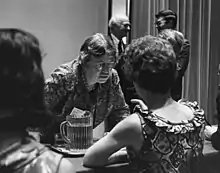 Following Ruth Benedict's example, Mead focused her research on problems of child rearing, personality, and culture.[28] She served as president of the Society for Applied Anthropology in 1950[29] and of the American Anthropological Association in 1960. In the mid-1960s, Mead joined forces with the communications theorist Rudolf Modley in jointly establishing an organization called Glyphs Inc., whose goal was to create a universal graphic symbol language to be understood by any members of culture, no matter how "primitive."[30] In the 1960s, Mead served as the Vice President of the New York Academy of Sciences.[31] She held various positions in the American Association for the Advancement of Science, notably president in 1975 and chair of the executive committee of the board of directors in 1976.[32] She was a recognizable figure in academia and usually wore a distinctive cape and carried a walking stick.[1]