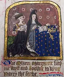 Many letters written by Margaret during her tenure as queen consort are still extant. One was written to the Corporation of London regarding injuries inflicted on her tenants at the manor of Enfield, which comprised part of her dower lands.[31] Another letter was written to the Archbishop of Canterbury.[32][33] Margaret's letters, which typically began with the words "By the Quene,"[34] are compiled in a book edited by Cecil Munro published for the Camden Society in 1863.[35]