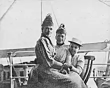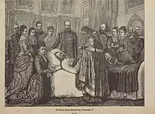 Maria's relationship with her father-in-law, Alexander II, deteriorated because she did not accept his second marriage to Catherine Dolgorukov. She refused to allow her children to visit their grandfather's second wife and his legitimized bastards, which caused Alexander's anger. She confided in Sophia Tolstaya that "there were grave scenes between me and the Sovereign, caused by my refusal to let my children to him."[38] At a Winter Palace reception in February 1881, she refused to kiss Catherine and only gave Catherine her hand to kiss.[39] Alexander II was furious and chastised his daughter-in-law: "Sasha is a good son, but you – you have no heart".[40]