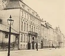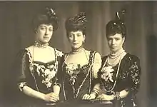 Princess Marie Sophie Frederikke Dagmar was born on 26 November 1847 at her parents' residence in the Yellow Mansion, an 18th-century town house at 18 Amaliegade, which is located immediately adjacent to the Amalienborg Palace complex, the principal residence of the Danish royal family in the district of Frederiksstaden in central Copenhagen.[8] She was the fourth child and second daughter of the then Prince Christian of Schleswig-Holstein-Sonderburg-Glücksburg, a member of a princely cadet line, and his wife Princess Louise of Hesse-Kassel.[9] She was baptised as a Lutheran in the Yellow Mansion with Queen Caroline Amalie of Denmark as her Godmother,[10] and named after her kinswoman Marie Sophie Frederikke of Hesse-Kassel, Queen Dowager of Denmark, as well as the popular medieval Danish queen, Dagmar of Bohemia, in accordance with the national romantic fashion of the time. Growing up, she was known by the name Dagmar. Most of her adult life, however, she was known as Maria Feodorovna, the name which she took when she converted to Orthodoxy immediately before her 1866 marriage to the future Emperor Alexander III.[11] Within her family, she was known as "Minnie" throughout her life.[12]