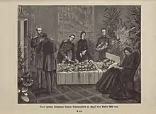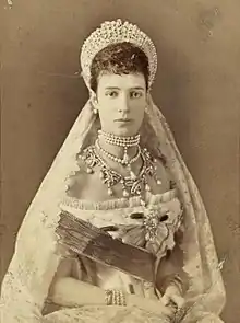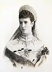 After returning to Russia to obtain his father's permission, Nicholas proposed to Dagmar on 28 September 1864 in the Bernstorff Palace Gardens and received a yes.[15] The engagement was announced at Bernstorff Palace later the same day.[10] Her future mother-in-law Maria Alexandrovna (Marie of Hesse) gave her a six-strand pearl necklace and Nicholas gave her a diamond bracelet.[1] In total, the betrothal gifts Dagmar received from her future in-laws cost 1.5 million rubles.[16]